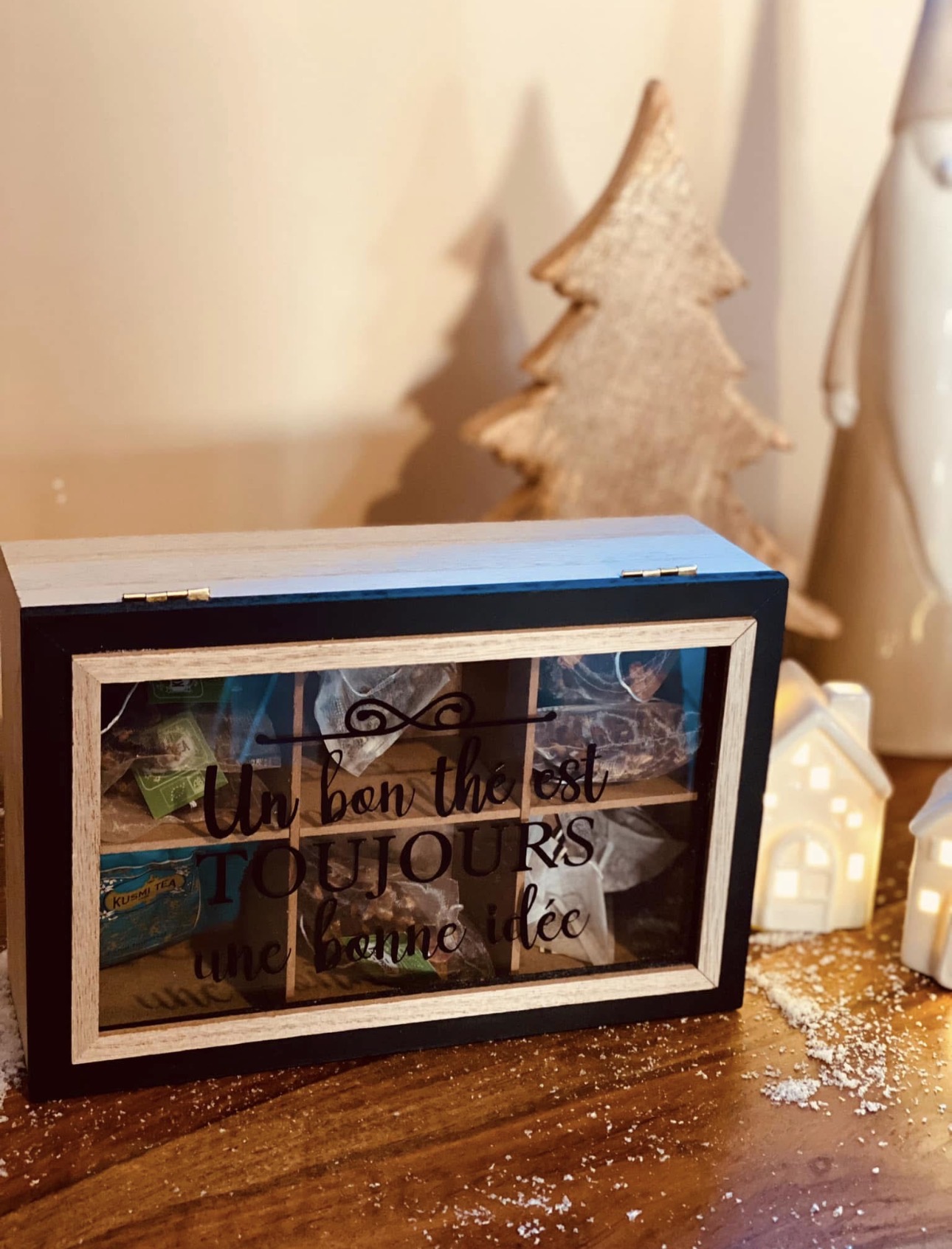 Son design naturel et chaleureux s’intègre parfaitement dans la déco de Noël, tout en gardant vos sachets de thé bien rangés et à portée de main.